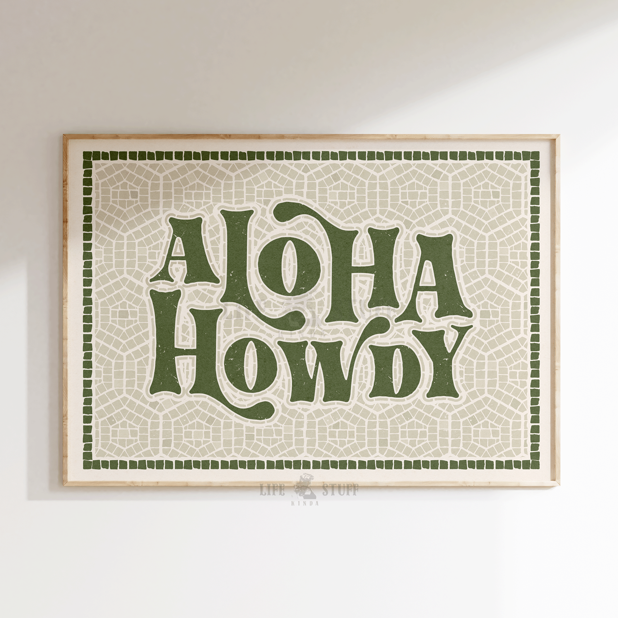 Aloha Howdy Wall Art Poster Modern Farmhouse Southwestern Print Western Ranch Decor Retro Eclectic Coastal Cowgirl Aesthetic Entryway Vintage Mosaic Tile Typography Print