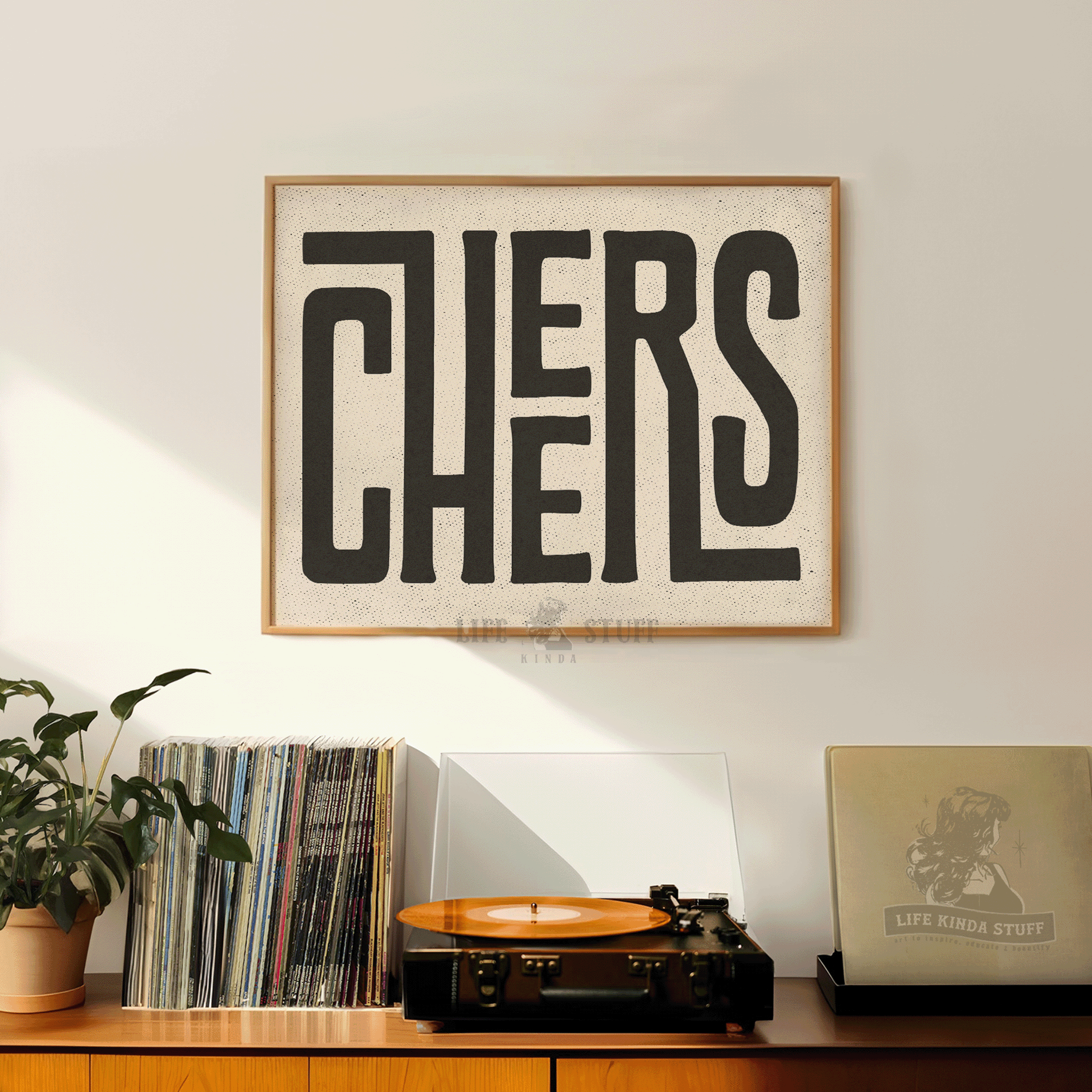 Cheers Print, Bar Cart Wall Art, Eclectic Dopamine Decor, Cocktail Lounge Poster, Trendy Happy Hour, Retro Typography, Mid Century Gift Modern Home Gallery Wall, Whiskey Wine Beer Art Gift For Him, Aesthetic Kitchen Dining Room Print