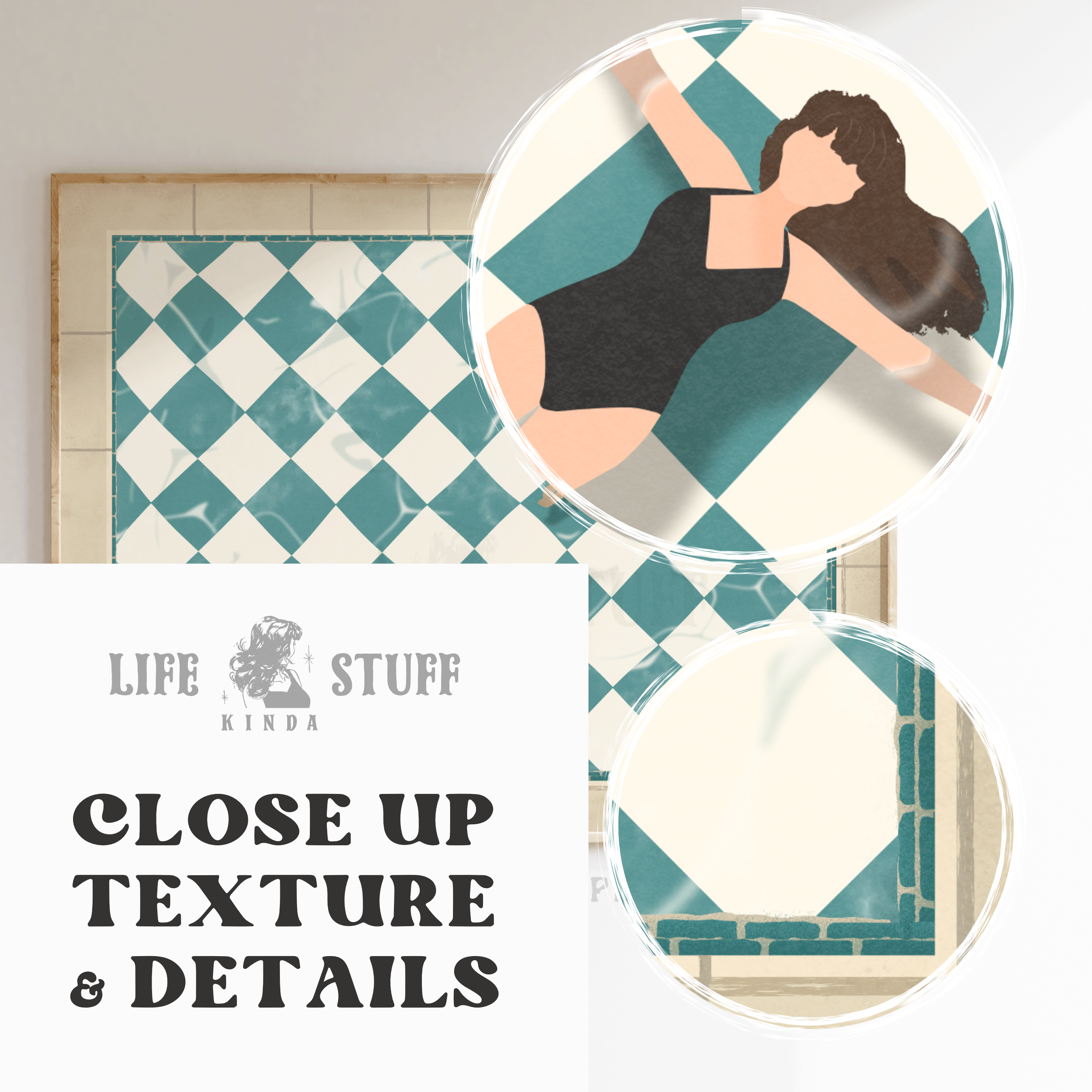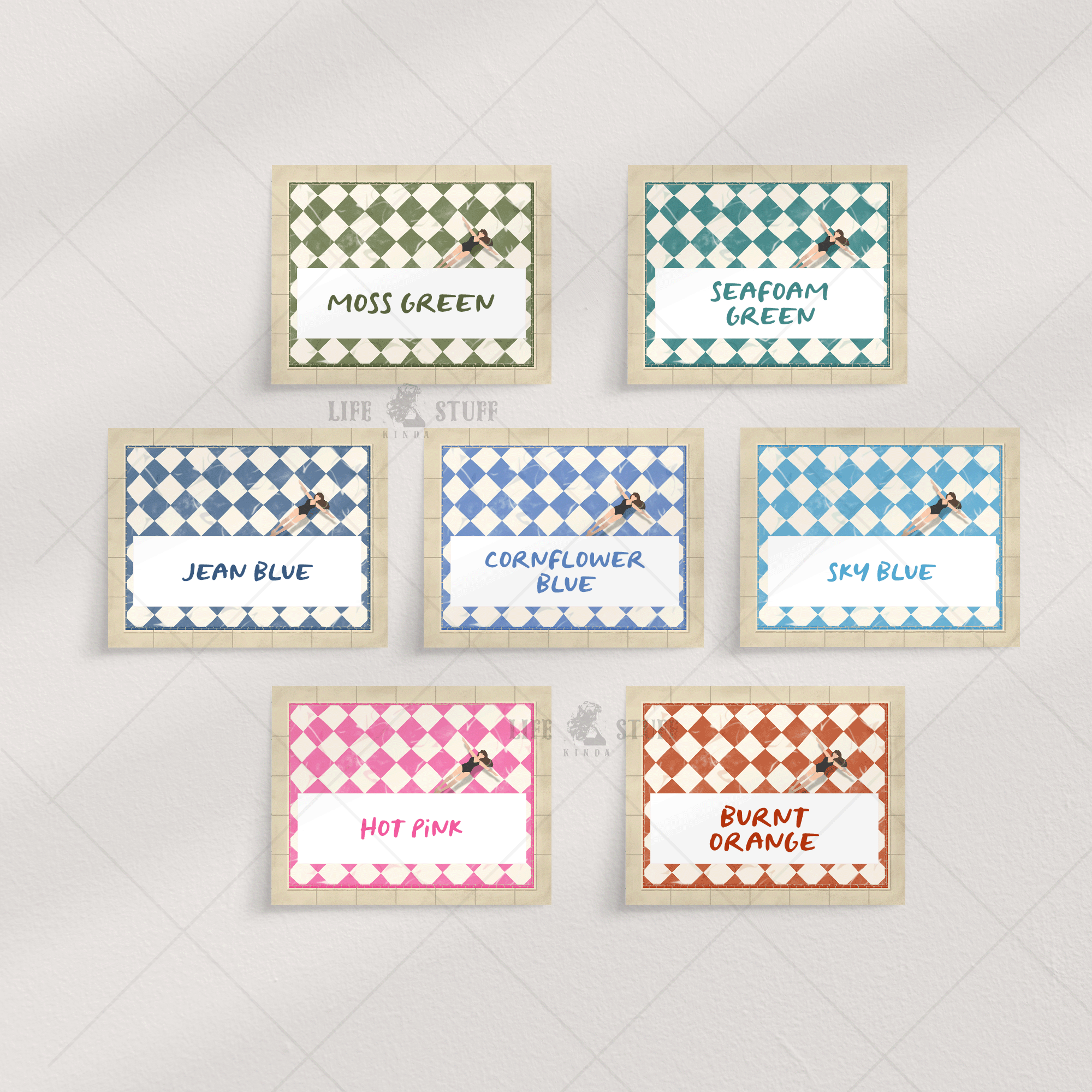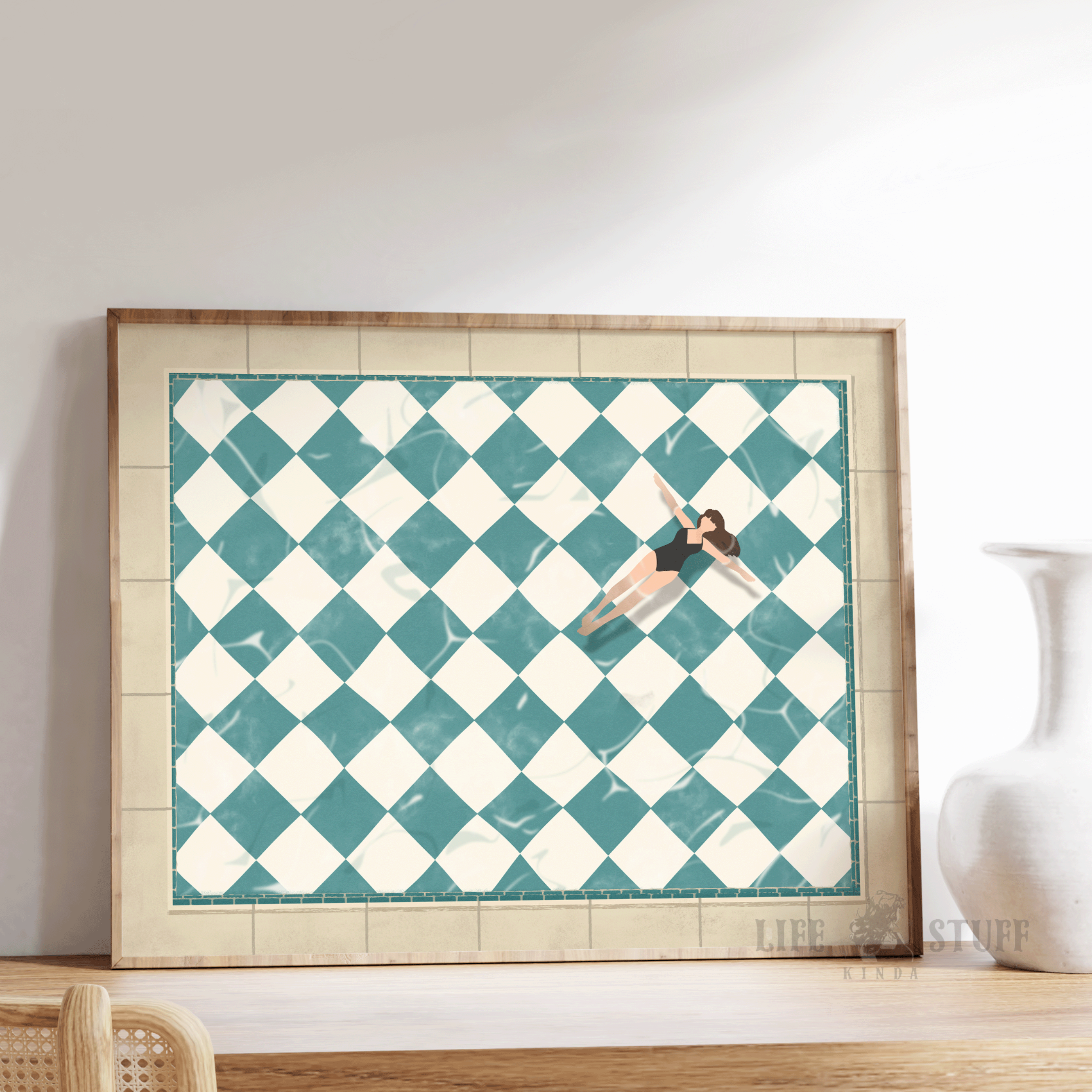 Girl Floating In Retro Checkerboard Pool Relaxing Bathroom Wall Art Tiny People Swimming Beach House Print Summer Lake House Woman Swimmer