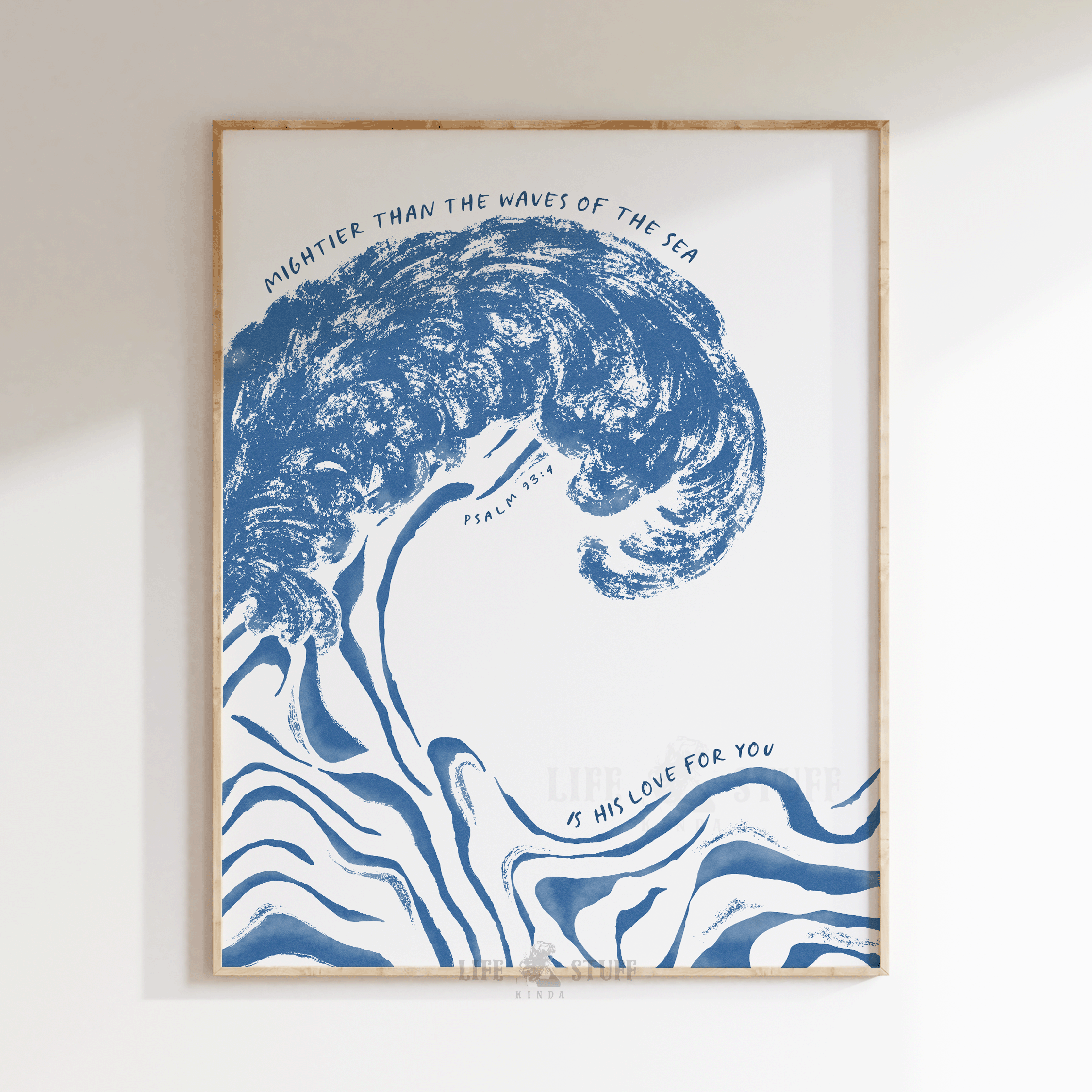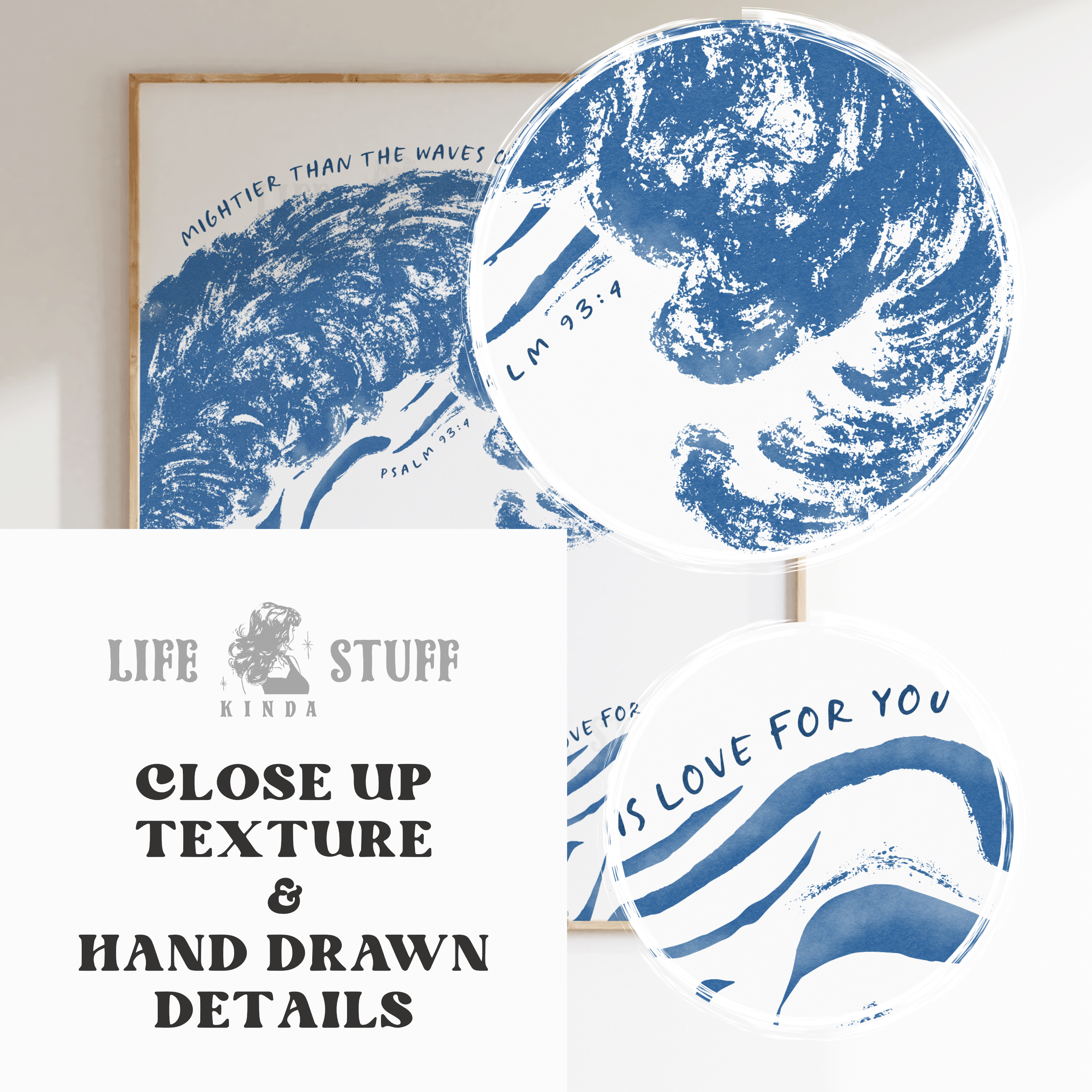 Mightier Than The Waves Is His Love For You Wall Art Coastal Christian Print Psalm 93:4 Scripture Sea Poster Abstract Ocean Blue Beach Bible Verse Beachy Home Decor