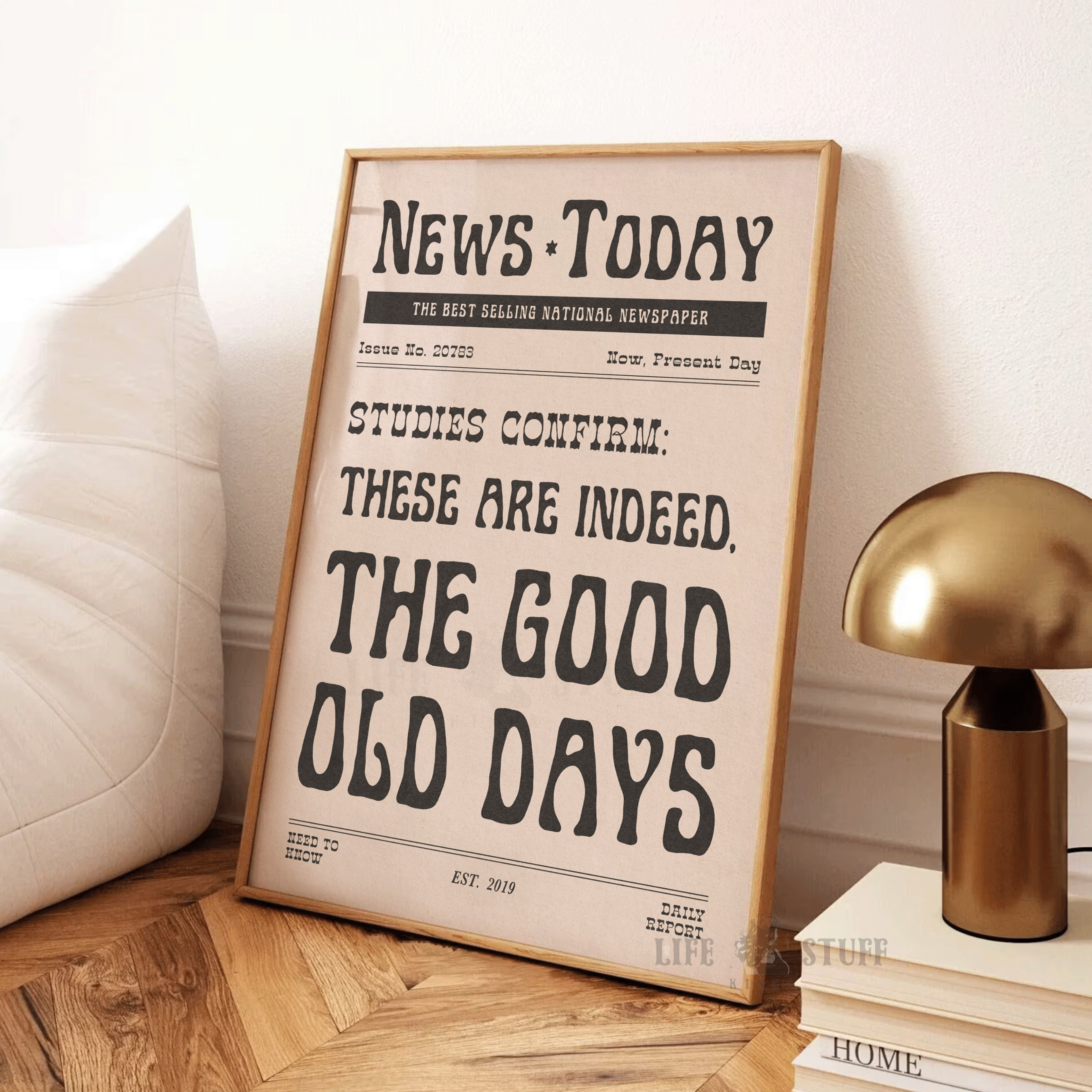 Trendy Newspaper Print, These Are Good Old Days Poster, Vintage Bar Cart Wall Art, Fake Headline Breaking News, Fun Apartment Decor, Retro Affirmation Giclee Print, Inspiration Entryway Decor, Neutral Living Room Print